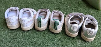 vendo 3 paradiso scarpeda ginnastica una bianca con retro verde adidas numero 21, una bianca bordo rosa puma 21 e una argento all star 20 tutte e tre usate in buono stato. 10 euro al paio