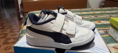 1 paio di scarpe da ginnastica marca Puma, bianche e blu misura 28 con strap;