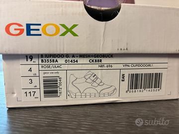 Scarpe Geox bambina Lupidoo numero 19. Colore rosa-lilla. Materiale suola: Gomma Altezza asta: Ankle Materiale esterno: Sintetico Materiale interno: Maglia e pelle Traspirante Mai usate perché piccole.