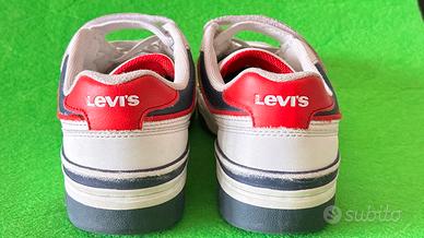 Vendo sneakers Levi’s originali da bambino, colore bianco con dettagli rossi.