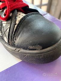 Scarpe Minnie (Disney), nr. 29. Colore nero a pois bianchi, con lacci rossi e apertura con cerniera laterale interna. In scatola originale.