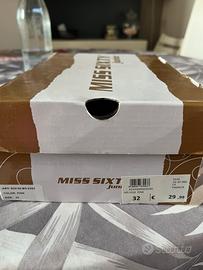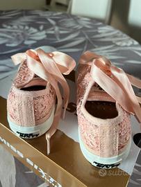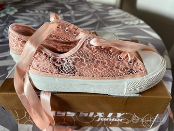 Scarpe Miss Sixty taglia 32 in pizzo color albicocca con stringhe in raso, perfette per cerimonia
