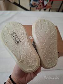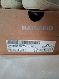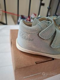 Scarpine primi passi marca Naturino modello Cocoon Vl, numero 17, colore salvia, con strappi. Materiale suola: gomma. Materiale esterno: velluto suede glitterato. Materiale soletta interna: pelle. Complete di scatola originale, quindi ottime anche come idea regalo.