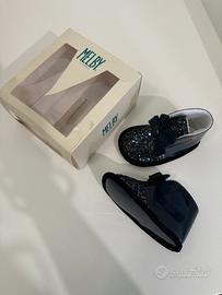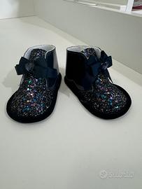 Bellissime scarpine per neonata di colore blu con dettagli scintillanti di brillantini. Perfette per completare l'outfit della tua piccola principessa. Ideali per occasioni speciali o per aggiungere un tocco di eleganza a qualsiasi giornata. Nuove complete di scatola