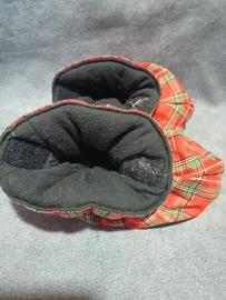Morbide scarpine scaldapiedi per neonato con fantasia tartan. Tessuto esterno a quadri rossi, verdi e gialli. Interno foderato in tessuto nero. Usate pochissimo non hanno difetti Chiusura con velcro.... Per attaccarlo alle tutine o pantaloni le misure sono in foto 🌹 guarda l ultima foto posso assemblare le due scarpette...le altre le trovi sempre qui pubblicate