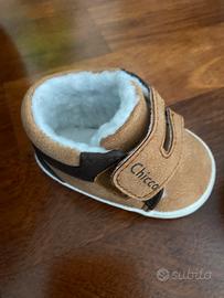 Scarponcini imbottiti per bambino, tipo di scarpa da culla, scamociati con pelliccetta all’onterno e chiusura a strappo. Numero 17. Chicco. Nuovi con scatola originale.