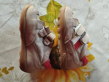 Vendo paio scarpe primaverili Kickers adatti sia per maschio che per femmina, in camoscio e tessuto beige, inserti rossi. Numero 21 allaccio con velcro in due punti. Plantare in pelle, suola in gomma antiscivolo. Età 1-3 anni