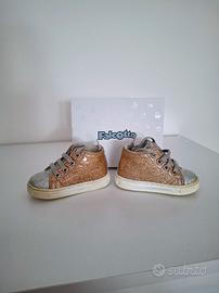 scarpe primi passi bambina falcotto con allacciatura con lacci, con glitter color argento, platino e cipria. Numero 19. La suola bianca è leggermente ingiallita sulla punta ma le scarpe sono in ottime condizioni