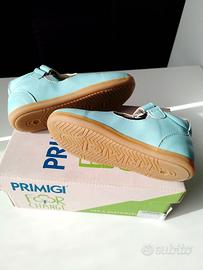 Scarpe bambino unisex Primigi numero 24, colore acquamarina, tomaia e rivestimento in pelle, soletta estraibile in sughero, suola in gomma antiscivolo, usate pochissimo, solo per trasferimenti su seggiolino auto e bici e per uscite con carrello rimorchio jogger, mai utilizzate per camminare in esterno, come nuove, suole perfette.