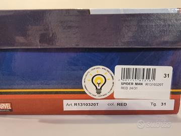 splendide scarpe Spiderman per bambini 4-5 anni, rosse con trama nera, dettagli luminosi. si illuminano quando camminare. perfettamente funzionante e tenute benissimo. taglia 31
