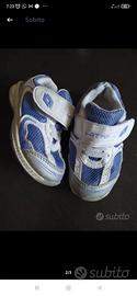 -scarpe ginnastica Lotto bianche azzurre unisex chiusura a strappo con falsi laccetti elastici taglia23, soletta interna estraibile 14,6 cm circa2/3 anni