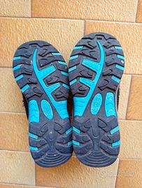 Scarpe da trekking per bambino, marca Cmp, numeri 32. Colore blu e azzurre, usate in ottime condizioni generali. Con stringhe non originali, presenta solo segni di usura visibili in foto.