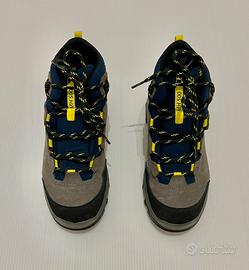 Scarponcini trekking bambino/a Quechua MH500 impermeabili grigi colore blu acciaio / verde acido numero 36 praticamente come nuovi in quanto utilizzati per poco piu di mezz’ora.