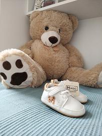 Scarpe culla bianche con orsetto e dettaglio color oro. Nuovo con cartellino. Taglia Eur 19 ma corrisponderà ad una 20. Con comoda chiusura a strappo. Suola morbida. Unisex