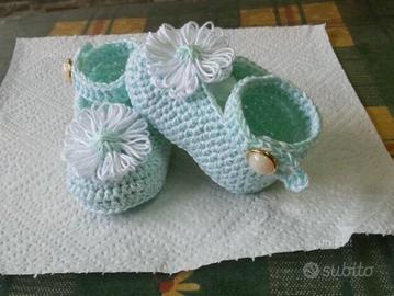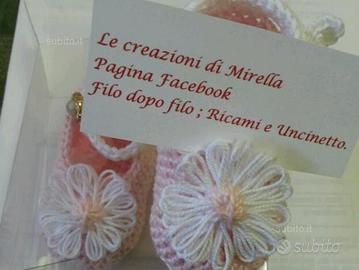 Vendo scarpette di cotone x bambina realizzate interamente a mano in confezione trasparente. Il prezzo è di 13 euro. Fascetta x capelli coordinabile con le scarpette 7 euro. Per altri miei lavori visitate la mia pagina facebook " Filo dopo filo; Ricami e Uncinetto"