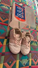 Scarpine Adidas da neonata, in pelle bianca con dettagli rosa chiaro. Le scarpine hanno: