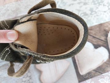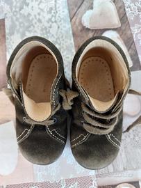 prima scarpa usata.Marca Naturino,tutta in pelle,morbidissima per primi passi e ben sostenuta ,chiusura con lacci.Color verde muschio. Numero 21