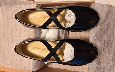 Scarpine eleganti in morbida vernice nera da bambina, marca Naturino, taglia 32 (calzano giusto), con elestici incrociati che tengono ben fermo il piedino, senza tirare. Indossate solo in una occasione.