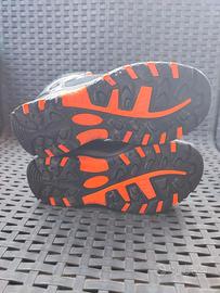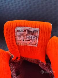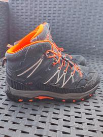 Vendo scarponcini da trekking bambino CMP modello Rigel Mid, numero 35 (225 mm). Caratteristiche: Membrana interna Clima Protect che garantisce l'impermeabilità lasciando respirare il piede. Suola FullOn GRIP con ottimo grip su terreni fangosi o scivolosi. Sistema di chiusura: Fast Lace (lacci rapidi con strozzatore), comodissimi per i bambini perché non devono fare i nodi. Stato: Molto buono. La suola (come da foto) è ancora ben scolpita e l'usura è minima. Colore: Grigio antracite con dettagli e lacci arancione fluo. Non spedisco. Solo ritiro a mano a Borgo San Dalmazzo.