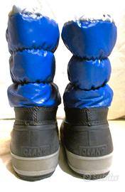 Scarponi da neve per bambino (tipologia doposci) marca OLANG modello BINGO BLUE/BLACK misura 31/32 con tomaia in poliestere ovattato e calda imbottitura interna in lana sintetica. Il robusto strato esterno in nylon trapuntato contribuisce a resistere alla neve, mentre il sottopiede con suola interna in alluminio trattiene il calore all'interno degli scarponi. L'apertura anteriore a zip integrale trattiene fuori la neve e i detriti e aiuta ad assicurare una calzata aderente. La robusta suola con base antiscivolo e ad alta aderenza mantiene saldi i piedi sul terreno nei mesi invernali. Trattasi di calzature utilizzate sulla neve solo una volta e per pochi giorni, pertanto sono sempre in ottime condizioni completamente ancora da sfruttare.