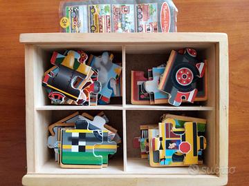 Gioco per bambini. Scatola con set di 4 puzzle di legno Melissa e Doug, tema veicoli (trenino, scuolabus, auto da corsa, camion pompieri).