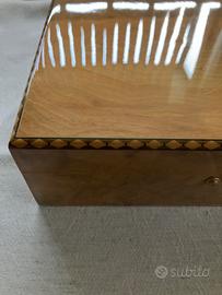 Vedo bellissima scatola da gioco in olivo. Contiene dadi , carte, fiches e panno verde. Misura lungh 28cm , larghezza 22cm, altezza 9 cm.