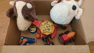 Ecco una scatola con giochi e peluche. Articolo nuovi o in ottimo stato