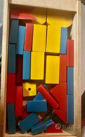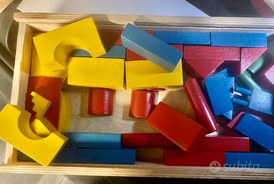 Scatola giochi di costruzione i legno da 36 pezzi. Perfetti come niovi. Ideali per sviluppare la manualuta dei bambini.