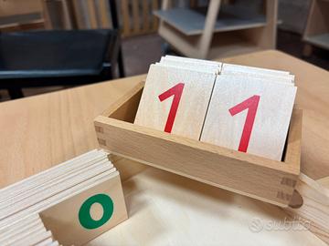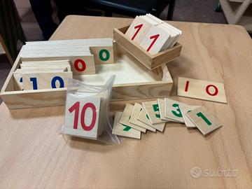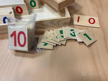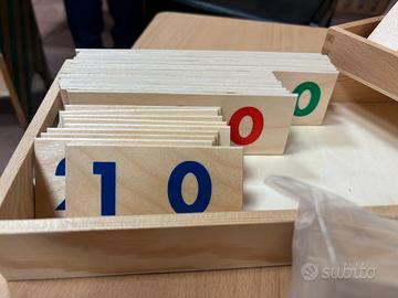 Scatola in legno contenente tavole numerate in legno colorate verde, rosso e blu da 1 a 9999 + numeri singoli per bambini dai 5 anni.