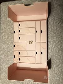 scatola con 12 cassettini. da un lato dei cassettini colore "neutro", dall'altro lato con numero chiaro da 1 a 12 (stile calendario dell'avvento). doppia apertura.