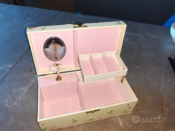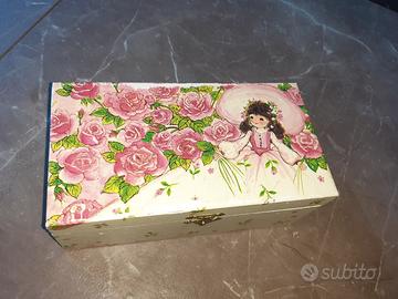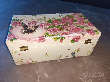 Scatoĺa portagioie con carillon ballerina, in legno compensato rivestito con decoupage, leggermente usurato nella parte superiore come da foto.
