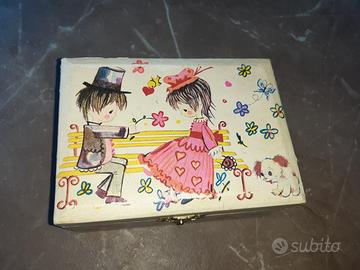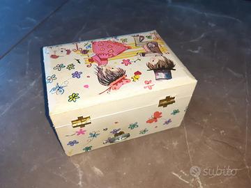 Scatoĺa portagioie con carillon ballerina in legno compensato rivestito con decoupage, leggermente usurato nel lato seperiore come da foto.