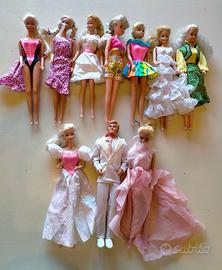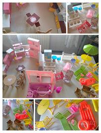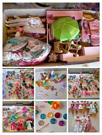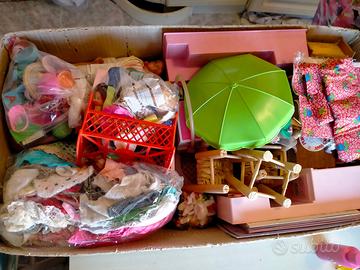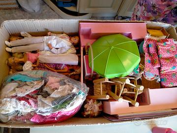 barbie e suoi set, alcuni mobili, vestiti, scarpe, monete, pannelli cartonato