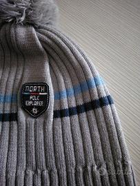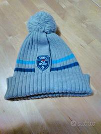 Sciarpa e cappello in lana grigio con inserti celesti e blu. Con pom pom e scudetti applicati. Lavorazione a coste rasata.