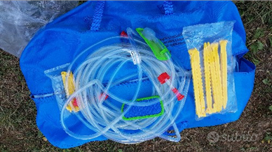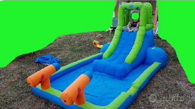 Vendo scivolo acquatico gonfiabile con cannoni spara acqua e spruzzi su scivolo (necessita rubinetto in prossimità). Dimensioni 480x 235x altezza 200cm. Ha uno strappo su un fianco di 1,5cm che però garantisco non pregiudica il divertimento dei bambini, vedasi foto, la bimba pesa 35kg e lo scivolo non ne risente. Completo di borsa, picchetti per ancoraggio al terreno, tubazioni e motore per il gonfiaggio. Tutto funzionante. Max 3 bambini contemporaneamente, max 135kg, peso max bambino 45kg, età minima 3 anni. Altezza bambini tra 90 e 150cm. Consegna a mano in zona. Visto e preso. In zona Scandicci (FI) è possibile fare prova gonfiaggio.
