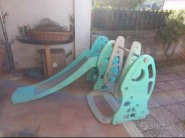 Vendo scivolo con altalena, in buone condizioni, va solo lavato e se si vuole aggiungere la rete del cestino del canestro. È stato tenuto sempre al coperto. È ideale sia per esterno che per interno.