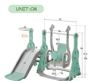 Sei alla ricerca di un giocho divertente e sicuro per il tuo piccolo per l'esterno? Il Parco Giochi 4 in 1 è perfetto per bambini da 0 a 2 anni e ha integrato scivolo, altalena, canestro e scala. Realizzato in materiale HDPE di alta qualità, è sicuro e resistente. E con le sue dimensioni compatte (118l x 102H cm), è perfetto per il tuo giardino o la tua casa. Usato per due stagioni, ha qualche segno (manca la rete), ma perfettamente funzionante e utilizzabile in sicurezza. Vedi foto.