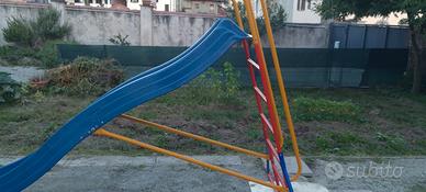 scivolo grande in resina molto robusto, struttura in acciaio verniciato rosso e giallo altezza 2 metri lunghezza 3 metri circa, in buono stato
