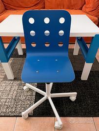 La sedia, dello stesso colore della scrivania, è dotata di rotelle ed è anch’essa regolabile in altezza.