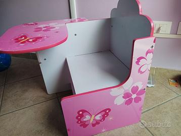 Tavolino e seggiolina per bambini, in legno, color rosa con decorazioni di fiori e farfalle. Ideale per cameretta.
