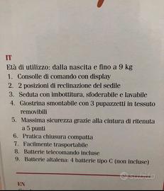 Utilizzata pochissimo. Console di comando con display. 2 posizioni reclinabili. Chiusura compatta. Dondola e suona