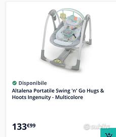 L'Altalena Compatta Hugs & Hoots di Ingenuity offre tessuti ultra soffici e confortevoli in delicati colori pastello. Cinque velocità di dondolio con timer a 3 tempi di spegnimento. 6 melodie rilassanti e 3 suoni della natura. L'innovativa tecnologia Hybridrive(TM) a risparmio energetico garantisce la massima durata delle batterie. L'altalena e' piegabile e adatta al trasporto. Cintura con 5 punti di ritenuta, struttura robusta, morbido cuscino ergonomico e piedini antiscivolo.