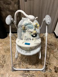 Si può utilizzare anche come sdraietta a dondolo. Dotata di telecomando per attivare a distanza il movimento della seduta e azionare le melodie musicali, con volume regolabile.