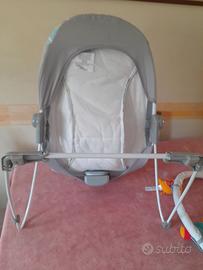 Sdraietta amaca Bright Starts con 2 giocattoli appesi, movimento vibrante e con musica a due tonalità. Piedini antiscivolo e cintura di sicurezza. Usata pochissimo come nuova