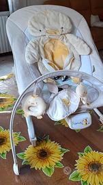 Per doppio regalo usata 1 volta e mancanza assoluta di spazio. Regolabile, con accessorio (mai usato) per fare musica, con manico con giochi appesi incorporati, con sagoma di pulcino per avvolgere il piccolo. Piedistallo regolabile in due posizioni per bloccare il dondolio come da foto. Con imballo originale.