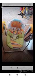 Schienale regolabile in 2 posizioni, morbido rivestimento in tessuto, riduttore ovattato per la testa, cinghia a 5 punti, arco parasole con 2 peluches removibili e regolabile anche in altezza in 2 posizioni, 3 velocità regolabili, timer di autospegnimento (10-20-30 min), 5 melodie, 3 suoni naturali, volume regolabile, piedini con gommini antiscivolo, funzionamento a batteria (4 pile modello C – 1,5 volts), predisposizione per l’utilizzo con corrente tramite trasformatore (IMPUT: 100-240V~50/60Hz 0,25A MAX, OUTPUT: 6V~1000mA). Possibilità di utilizzo come sdraietta bloccando l’oscillazione della seduta. Rivestimento sfoderabile e lavabile a 30°C. Chiusura compatta. Scatola regalo.