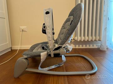 Sdraietta con funzioni dondolo e poltroncina, dotata di schienale regolabile, cuscino riduttore e barra gioco. Presenta qualche eegno di usura sulla struttura di metallo.