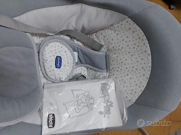 Sdraietta Chicco Relax & play regolabile con dondolio automatico a pile misure cm 69,5 x 60 x 58,5 colore grigio ghiaccio con seduta imbottita colore bianco a cuoricini grigio perla e cintura di sicurezza dondolo a 5 velocità con melodie musicali adatta fino a 9 kg