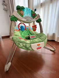 Sdraietta con vibrazioni calmanti per rilassare il bambino. Include una barra giochi rimovibile con giocattoli a tema foresta pluviale, come scimmie e foglie rotanti.