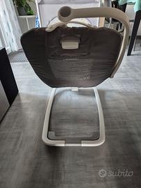 Dondola o si muove delicatamente su e giù con una piccola spinta o quando il bimbo si sposta. Dotata di: seduta reclinabile in 3 posizioni e poggiagambe regolabile in 2 posizioni; 2 velocità di vibrazione abbinate a 5 ninne nanne classiche e 5 suoni della natura; morbido supporto per il corpo del bambino; arco giochi rotante ed estraibile con 2 giochini; cintura SoftTouch a 3 punti con morbido copri-fibbia.